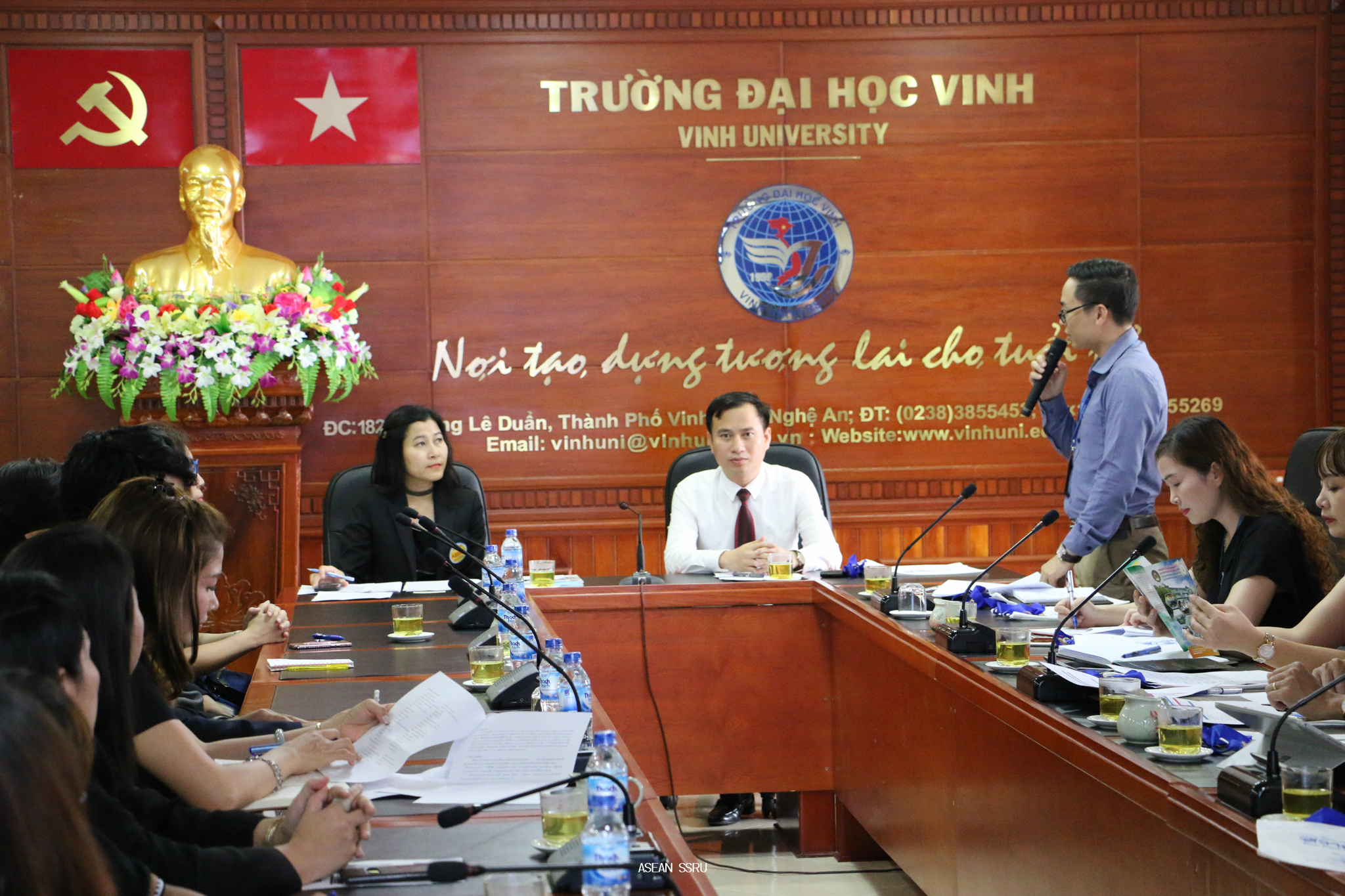 On 22 September 2017....the Center for ASEAN Studies and Training (CAST) led by Asst. Prof. Siri-Orn Champatong, Director, and CAST team has recently conducted the "Cooperative Network Extension with International University Project" in the Socialist Republic of Vietnam by taking the executives and lecturers from the Faculty of Education, Faculty of Science and Technology, Faculty of Humanities and Social Science, Faculty of Industrial Technology and College of Innovation and Management and the staffs who had the top attendance of the "English Proficiency Development Project" to attend the meeting at Vinh University (VU). In order that, it was our honored to have Assoc. Prof. Dr. Nguyen Huy Bang, Vice-President, and VU delegates at the welcoming. This meeting was aimed to introduce the Vinh University and Suan Sunandha Rajabhat University, and discuss for the further academic cooperation; the possibility of the academic and research cooperation, and drafting the Memorandum of Understanding (MOU).