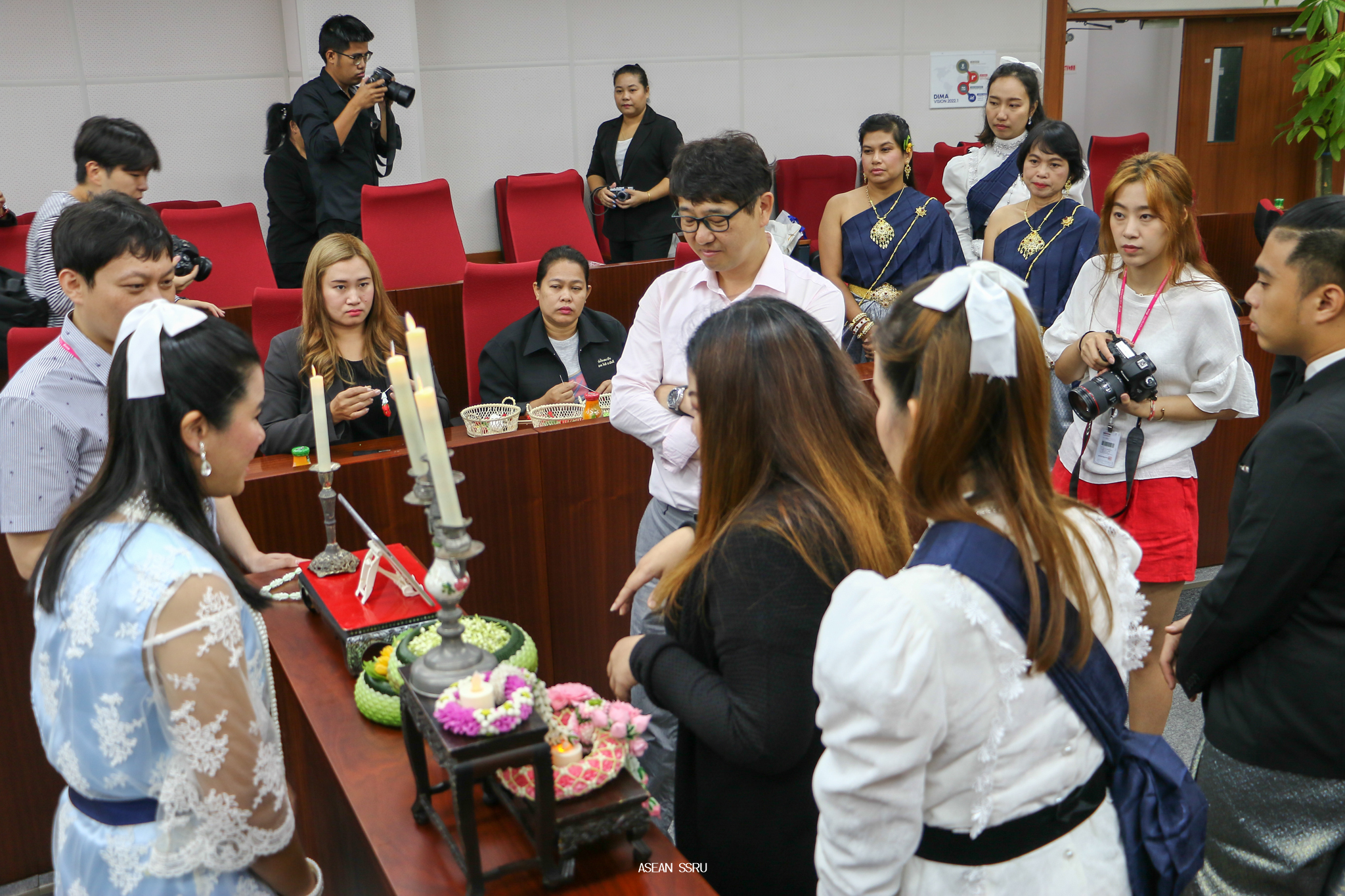 โดยในช่วงเช้า คณะผู้บริหารและเจ้าหน้าที่ได้นำเสนอข้อมูลสำนักศิลปะและวัฒนธรรม พร้อมทั้งจัดแสดงการแต่งกายชุดไทยในแต่ละสมัย และสาธิตการร้อยมาลัย ให้แก่ทางคณะสำนักงานฝ่ายต่างประเทศ ได้แก่ ดร. ยูนชุล คิม (ผู้อำนวยการ), นายจองมิน จุง (ผู้จัดการ), นายวูยอง อาน (ผู้ประสานงาน) นายเดียน ชอย (ผู้ช่วย) และนักศึกษา